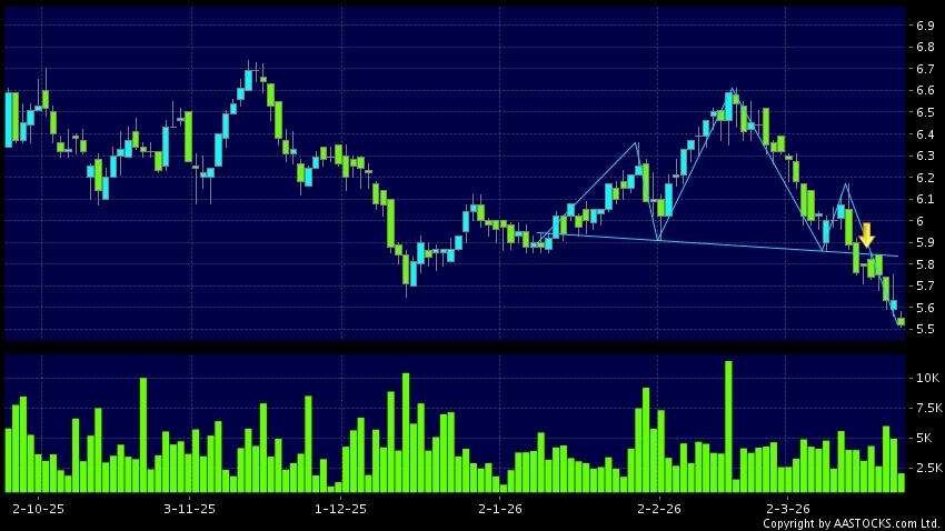 Head Shoulders top is a typical bearish signal, when stock price breaks the supportive level, downtrend would possibly start.(HK stocks quote is delayed for at least 15 mins.Short Selling Data as at 2026-04-02 16:25.)