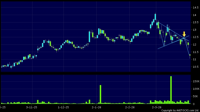 Triangle Breakout means the volatility of price movement is decreasing, stock price finally broke the bottom of triangle. A downward trend will start.(HK stocks quote is delayed for at least 15 mins.Short Selling Data as at 2026-03-30 16:25.)