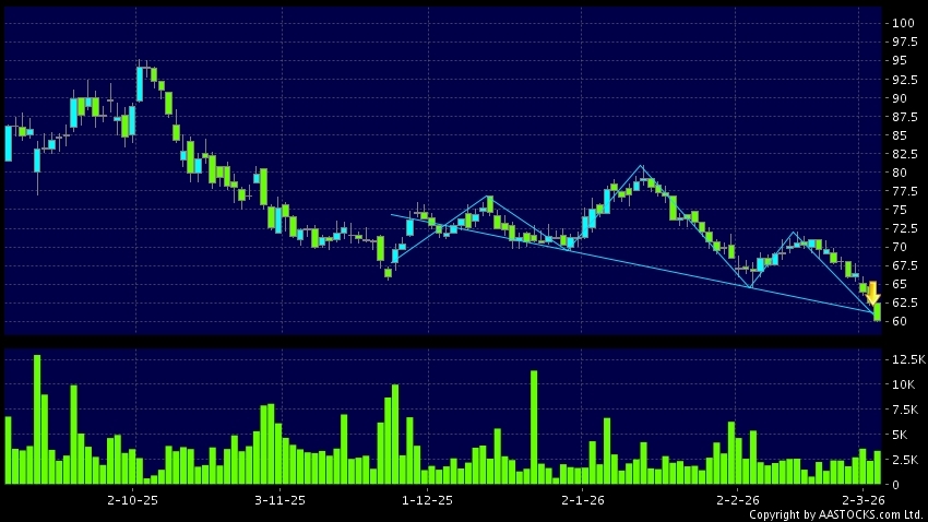 HENGRUI PHARMA(01276.HK)  -2.300 (-3.680%)    Short selling $17.12M; Ratio 6.483%   appears a downside breakout, dropped below the neckline. Last printed at 60.350; fell 3.440%; on volume of 3.42M shares and turnover of $207.87M