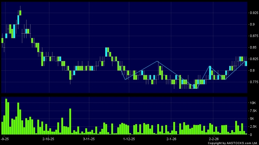 HAITONG UT(01905.HK)  +0.010 (+1.282%)   shows a triple bottom reversal. Last printed at 0.820; Flattish; on volume of 388.00K shares and turnover of $318.50K