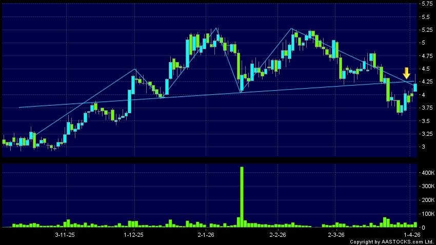 Head Shoulders top is a typical bearish signal, when stock price breaks the supportive level, downtrend would possibly start.(HK stocks quote is delayed for at least 15 mins.Short Selling Data as at 2026-04-02 12:25.)