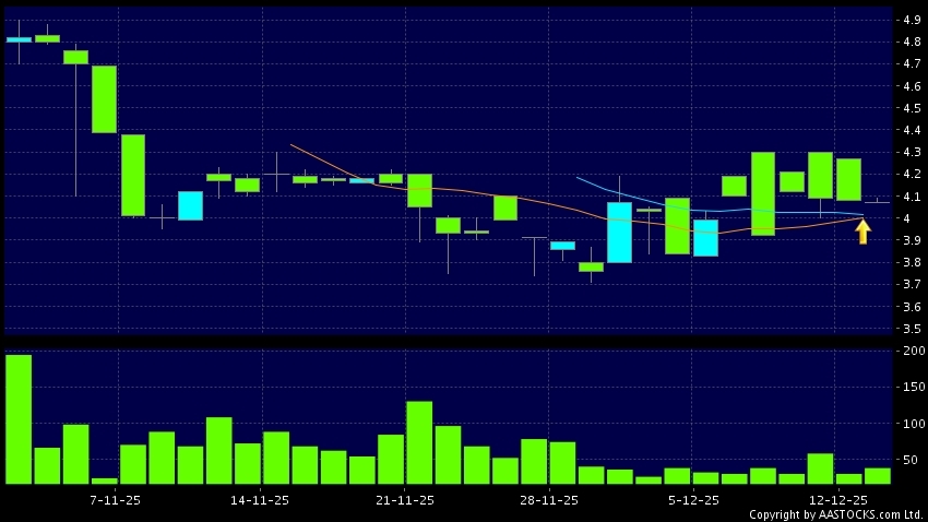 OCEAN ONE HLDG(09876.HK)  0.000 (0.000%)   's SMA 10 crosses above SMA 20, which is a golden cross. Last printed at 4.070; fell 0.245%; on volume of 38.00K shares and turnover of $154.86K