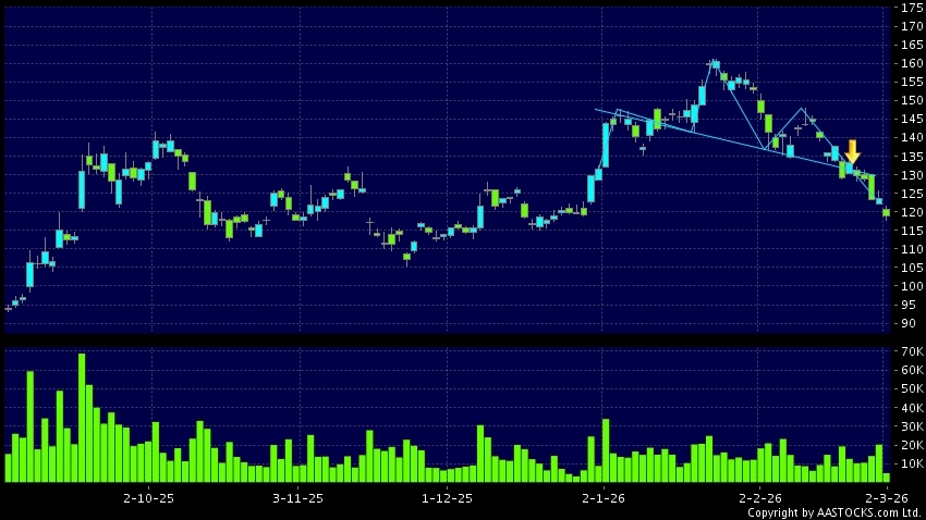 BIDU-SW(09888.HK) appears a downside breakout, dropped below the neckline. Last printed at 119.100; fell 3.719%; on volume of 5.14M shares and turnover of $613.60MRecent Performanc...