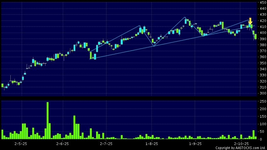 HKEX-R(80388.HK) appears a downside breakout, dropped below the neckline. Last printed at 389.600; fell 1.913%; on volume of 17.60K shares and turnover of $6.93MRecent PerformanceI...