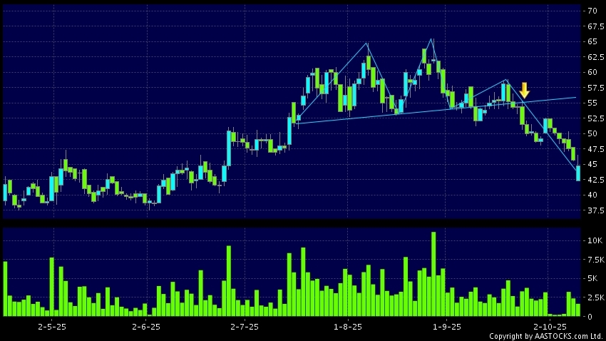 头肩顶是典型的沽出讯号,当股价跌穿支持线(颈线)时,跌势确认股价将持续下跌,技术走势偏软。(港股报价延迟最少十五分钟。沽空资料截至 2025-10-16 12:25。)