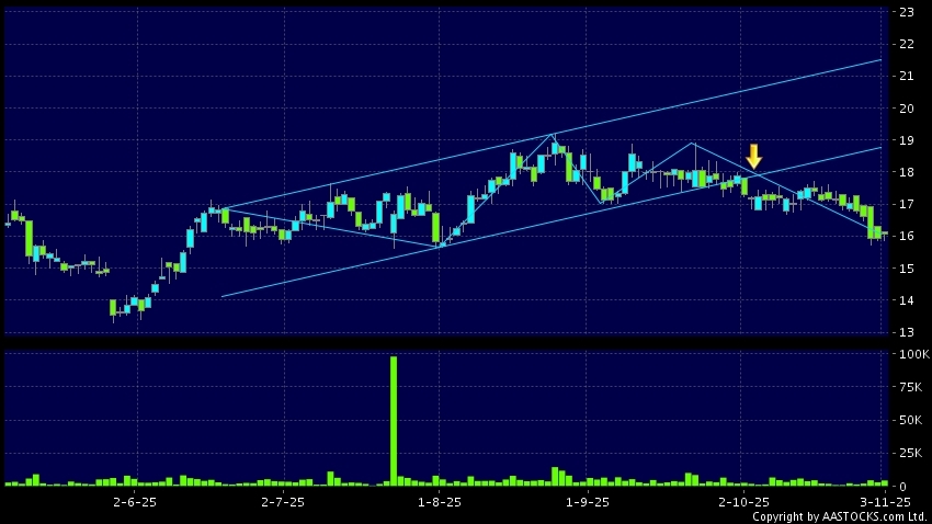 區域突破指股價在過去的一段時間只在一個範圍在內活動,然後股價下跌作出突破,跌穿區域的底部,技術走勢偏軟。(港股報價延遲最少十五分鐘。沽空資料截至 2025-11-05 16:25。)