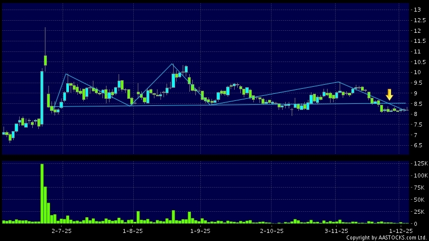 德翔海運(02510.HK) -0.050 (-0.626%) 沽空 $33.38萬; 比率 5.403% 呈現頭肩頂向下突破。現價報8.190,無升跌,成交量1.23百萬股,成交額1.02千萬。