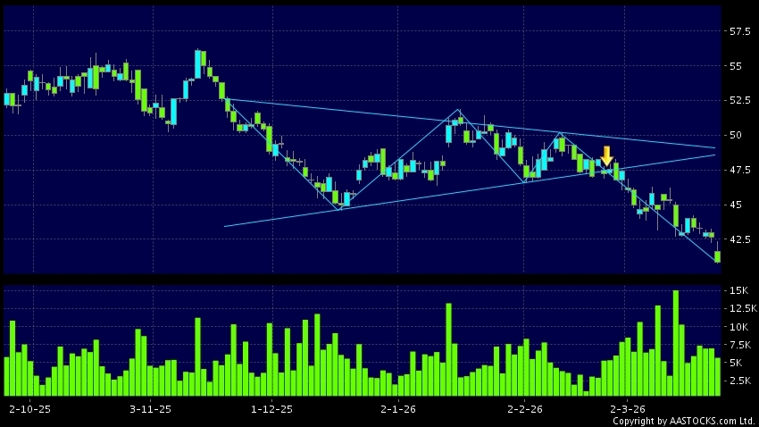 三角形向下突破是指股價的波幅漸漸收窄,在圖表上形成三角形般的狀態。股價在三角形的末端向下突破,下跌趨勢形成,技術走勢偏軟。(港股報價延遲最少十五分鐘。沽空資料截至 2026-03-24 16:25。)